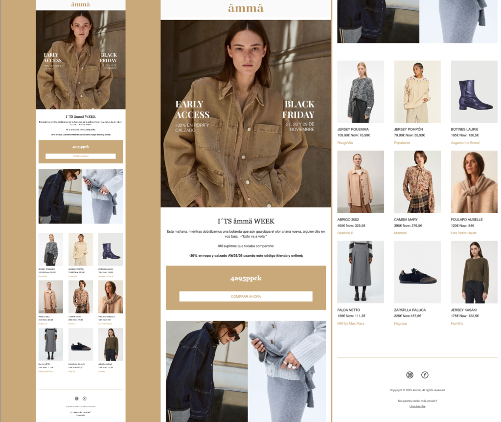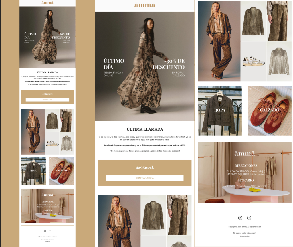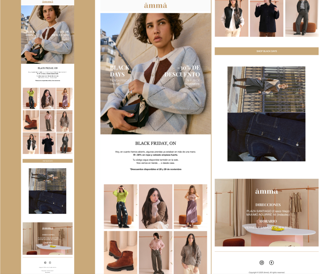 Desde Apartamento 44 gestionamos su estrategia de email marketing, creando un calendario mensual de cuatro newsletters. Nos encargamos de la definición de contenidos, el tono y el storytelling de cada envío, así como de la comunicación de campañas, novedades y momentos clave, conectando la experiencia de tienda física y online y manteniendo una comunicación coherente con la identidad de ämmä.